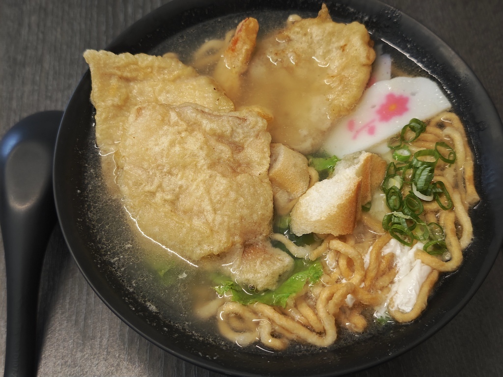 這碗有半顆全熟蛋、炸蝦、炸魚、魚板、麵麩、蔥及青菜等食材