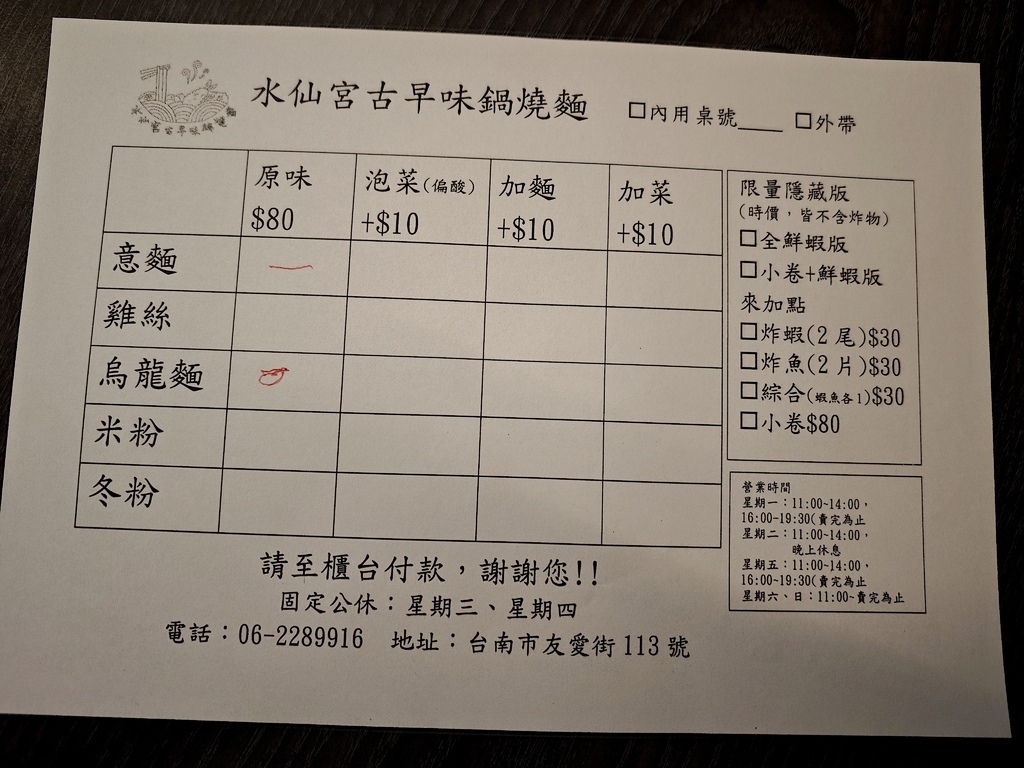 這張是店家點菜單供客人直接畫選,菜單鍋燒有原味和泡菜兩種口味,麵條有5種樣式供挑選。